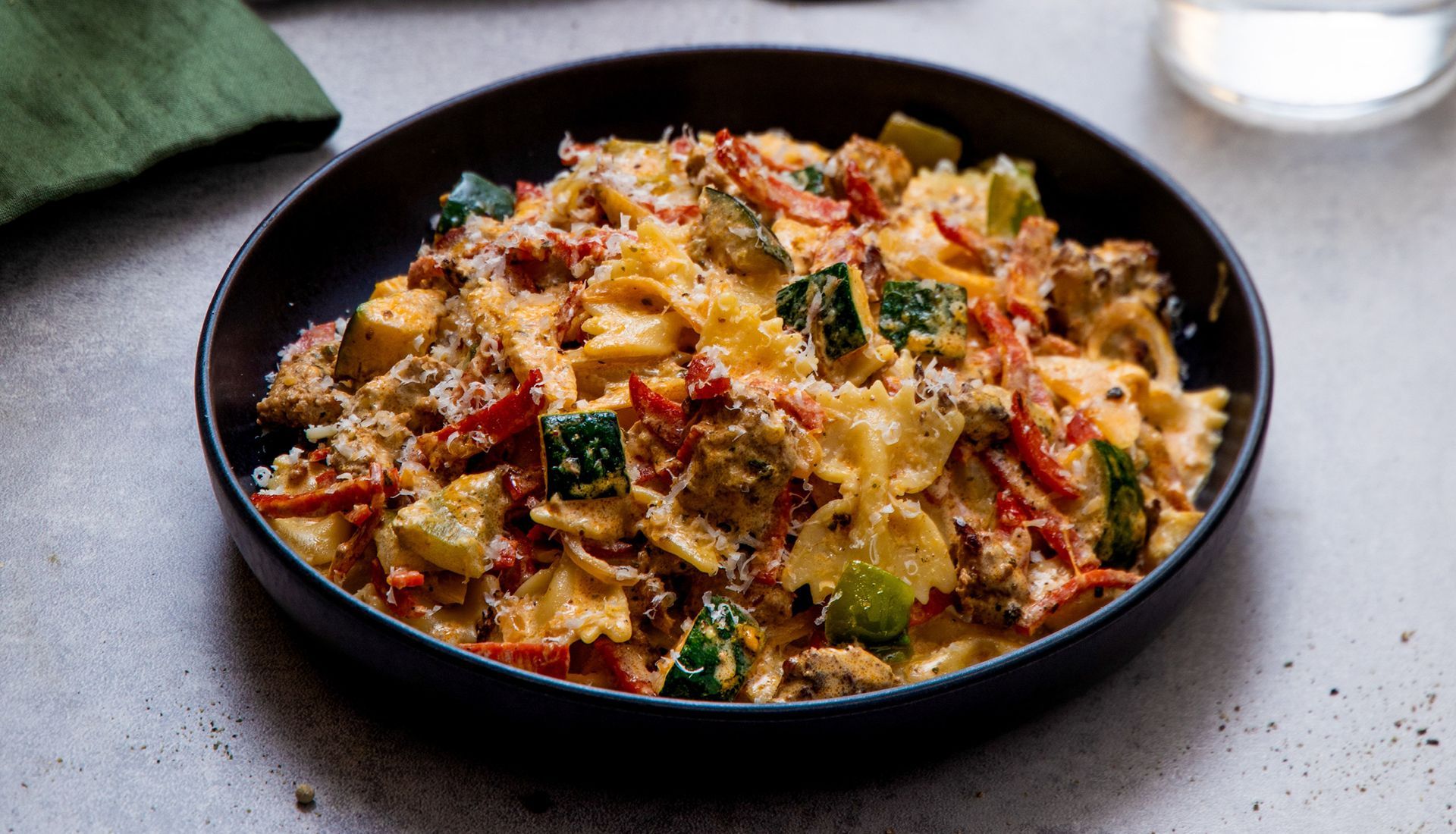 Neste rett er pastasløyfer med svinestrimler og pepperoni i mild oste- og urtesaus. Retten er rask å lage, og er klar til å spise på kun 15 til 20 minutter.