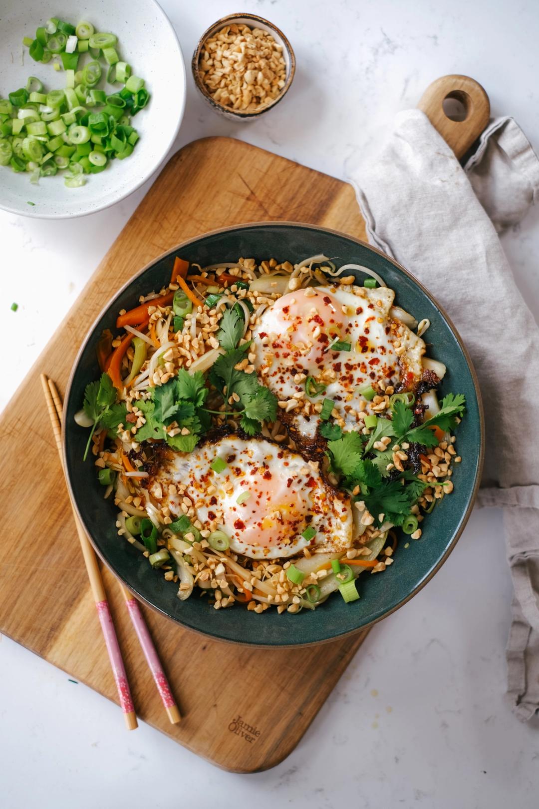 Thailandsk stirfry med chilistekte egg, pak choy, nudler og bønnespirer