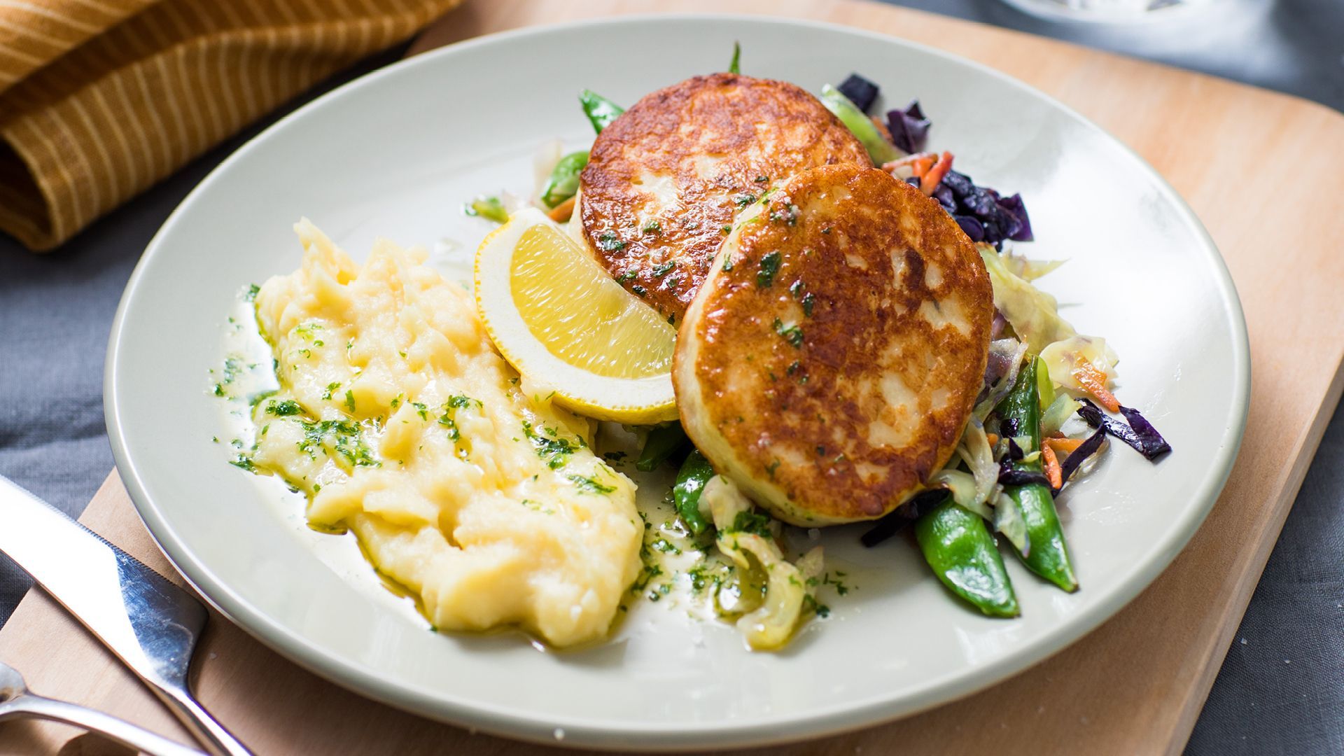 Fiskekaker med potetmos og lun råkostsalat