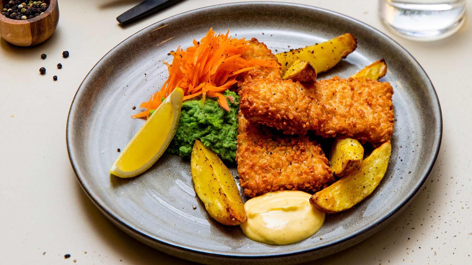 Fish & chips med ertepuré og revet gulrot