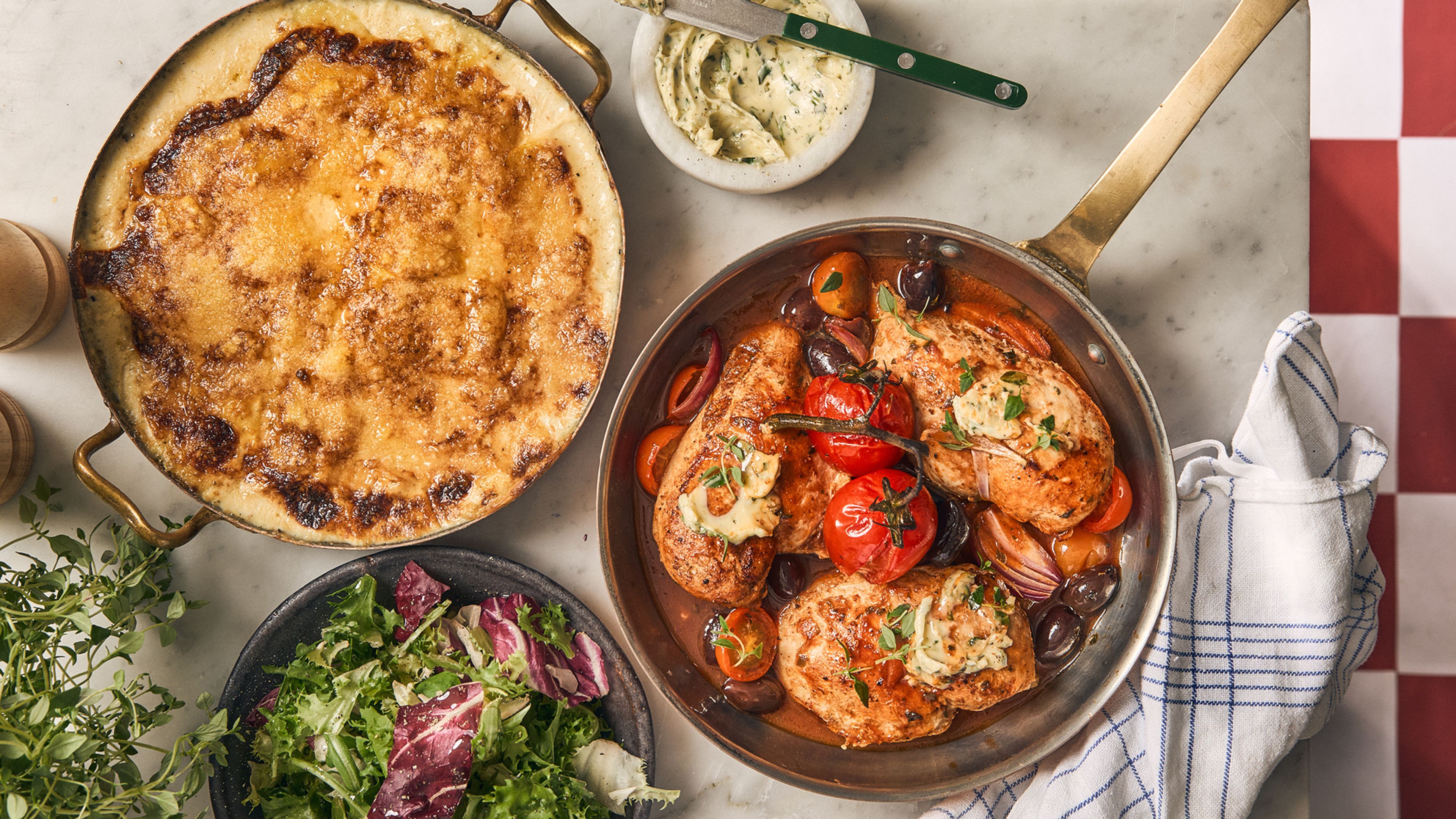 Saftig kylling i smakfull sjy med timian, cherrytomater og oliven.Dette er autentiske smaker fra Sør-Frankrike! Som perfekt følge til den saftige kasserollen får du klassiske fløtegratinerte poteter, kremet og gyllenbrune - en nydelig kontrast i både tekstur og smak. Dette passer både til hverdags og fest!