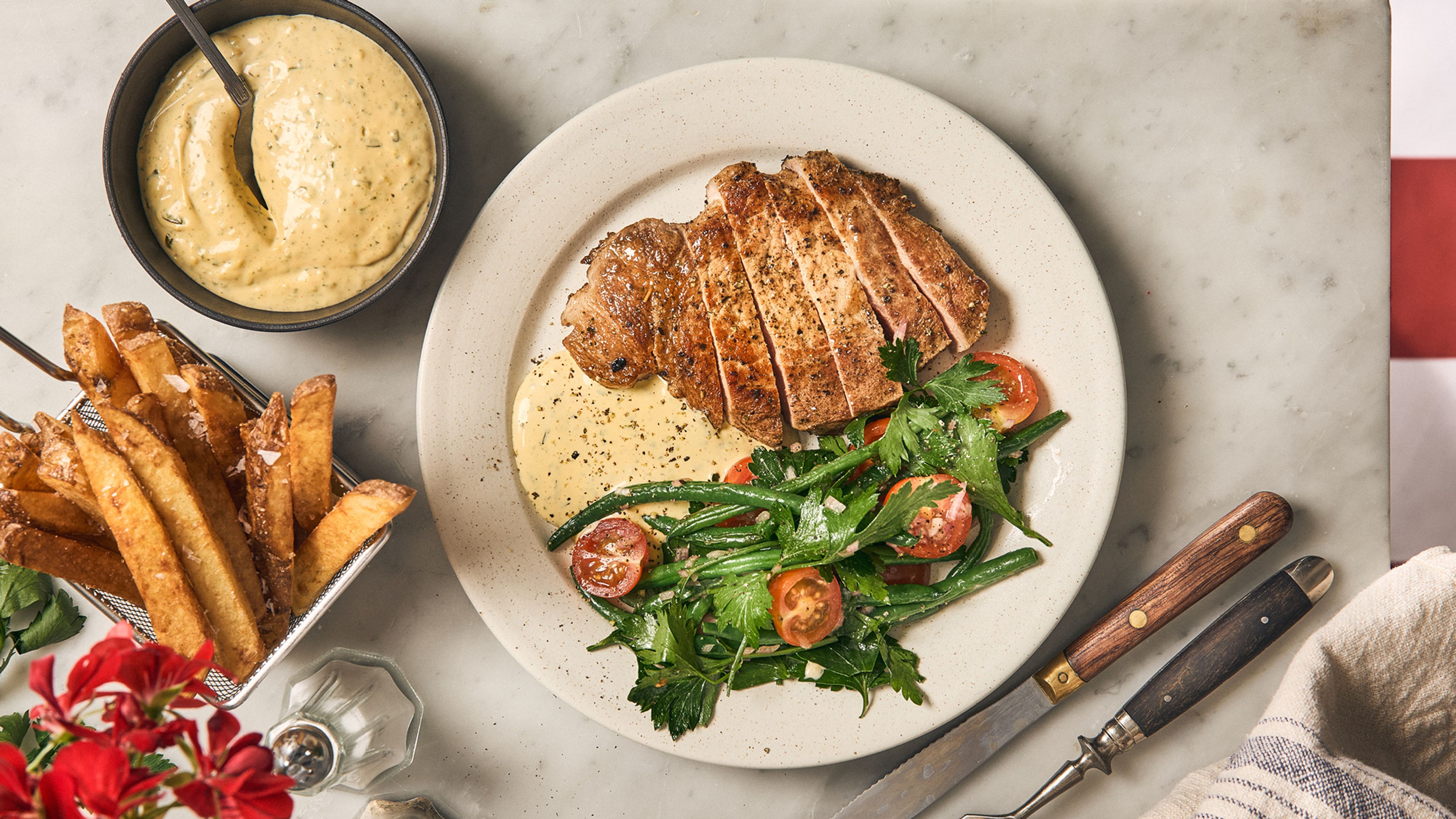 Finnes det noe mer fransk enn pommes frites med bearnés? Kanskje, men vi kan ikke komme på noe. Ikke finnes det noe bedre eller mer smakfullt, heller. Paret med saftig, urtestekt svinekam og grønne bønner med deilig tyggemotstand – dette er kanskje det beste av fransk bistromat. Og ikke vær redd, du skal bare varme opp sausen, så ingen kjøkkenkatastrofer i sikte.