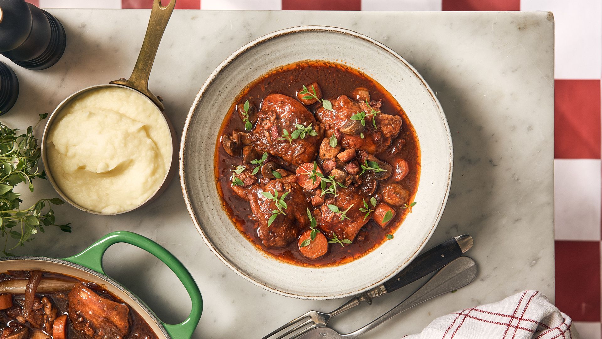 Coq au vin - Kyllinggryte med bacon, sjampinjonger og potetmos