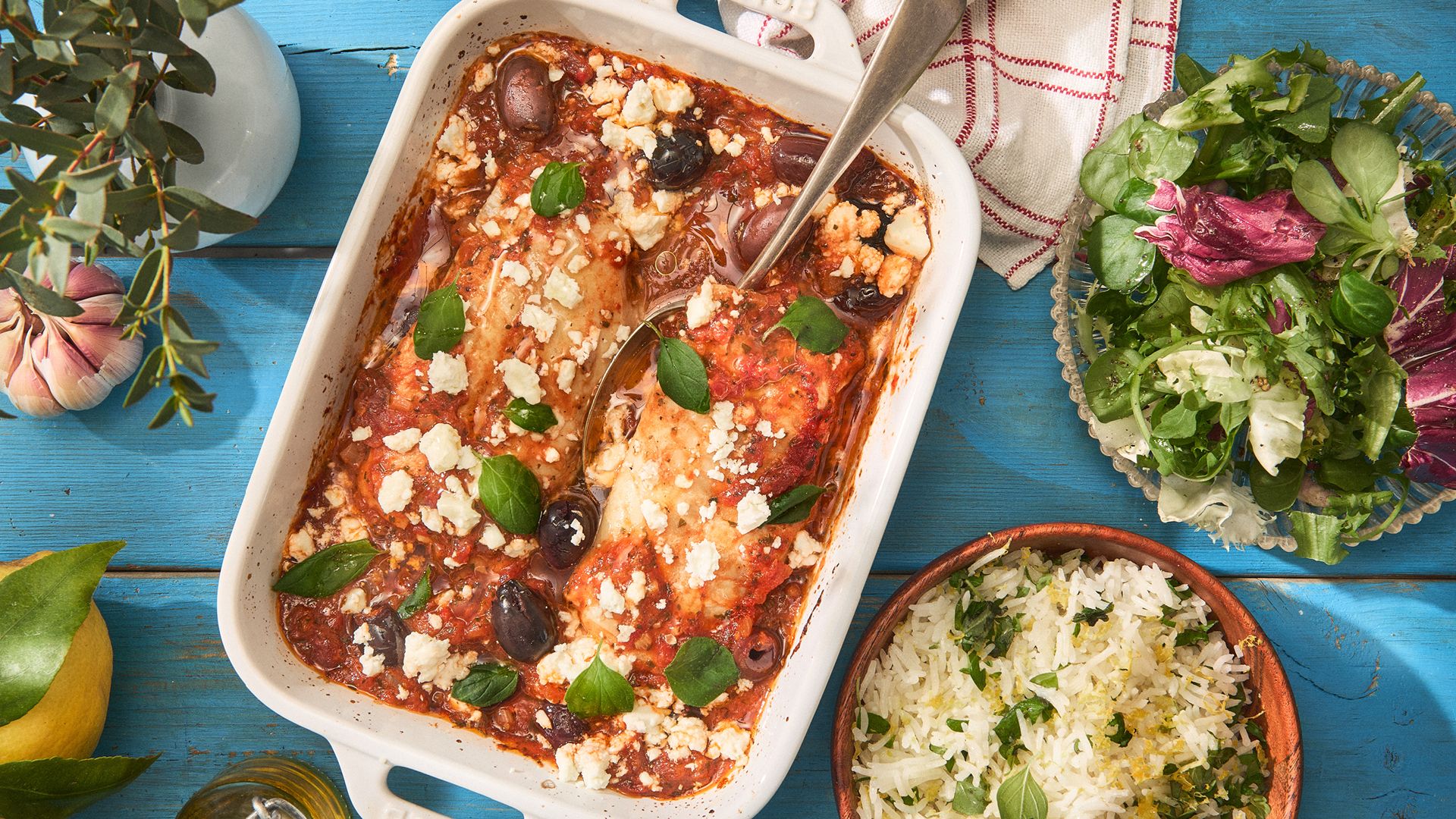 Psari plaki – Tomatisert lyr med oliven, fetaost og sitronris