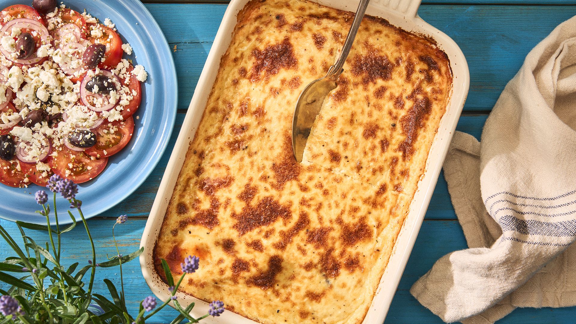 Du er kanskje kjent med moussaka fra før - en klassisk gresk form, som tradisjonelt lages med aubergine, poteter og kjøttsaus. Vi har laget en vegetarvariant med en smakfull tomat- og linsesaus. Til moussakaen serverer vi tomatsalat med rødløk, kalamataoliven og fetaost. Nærmere Hellas kommer du knapt!