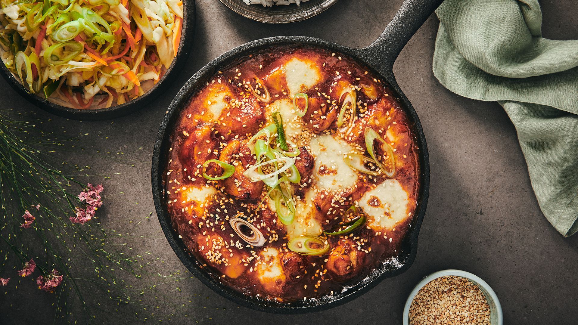 Buldak, eller ildkylling, er tradisjonelt en sterkt krydret kyllingrett. Buldaks intenst krydrede smak har bidratt til at koreansk mat har blitt en populær trend verden rundt – og det er ikke noe rart, synes vi! Buldak består av kyllingbiter marinert i en blanding av koreansk chilipaste (gochujang), sukker, soyasaus, hvitløk, ingefær og andre krydre. En annen viktig ingrediens er chiliflak eller chilipulver. Det er dette som gir retten den karakteristiske fargen! Kyllingen grilles eller friteres til den er sprø med masse krønsj, og serveres med ulike tilbehør som balanserer de hete smakene. Retten kan også gratineres i ovnen, gjerne med ost på.