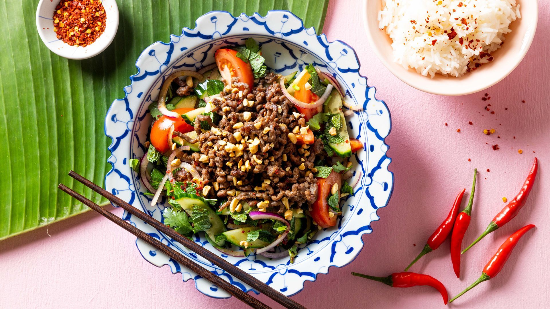 Denne supergode middagssalaten er inspirert av larb moo, en gjenganger på thailandske middagsbord. Den har alt det beste fra det thailandske kjøkken: friske urter, ris, kjøttdeig av storfe og krønsjy peanøtter. Smakene er en perfekt miks av syrlig og søtt, akkurat som thailenderne liker det. Ikke nok med det – du smeller den sammen på null tid, så her er det bare å glede seg!
