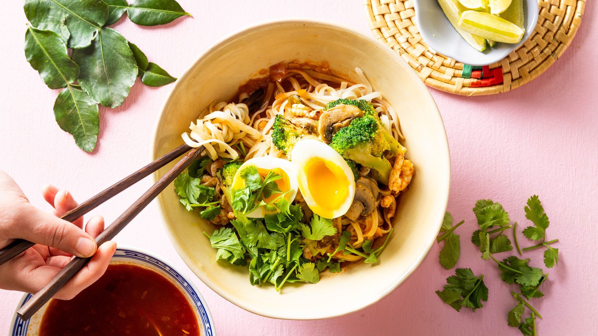Tom Yum er en thailandsk klassiker vi ikke kommer utenom. En varmende og syrlig nudelsuppe med base av fiskekraft og tomatpuré, med marinerte reker, friske grønnsaker, et smilende egg – og prikken over i'en: masse frisk koriander. Med andre ord, dette er en smaksbombe du ikke blir lei av! Hvis du ikke er så glad i sterk mat, kan du selvfølgelig lage den litt mildere. Det er det fine med thailandsk mat, den kan tilpasses akkurat slik du liker det best.