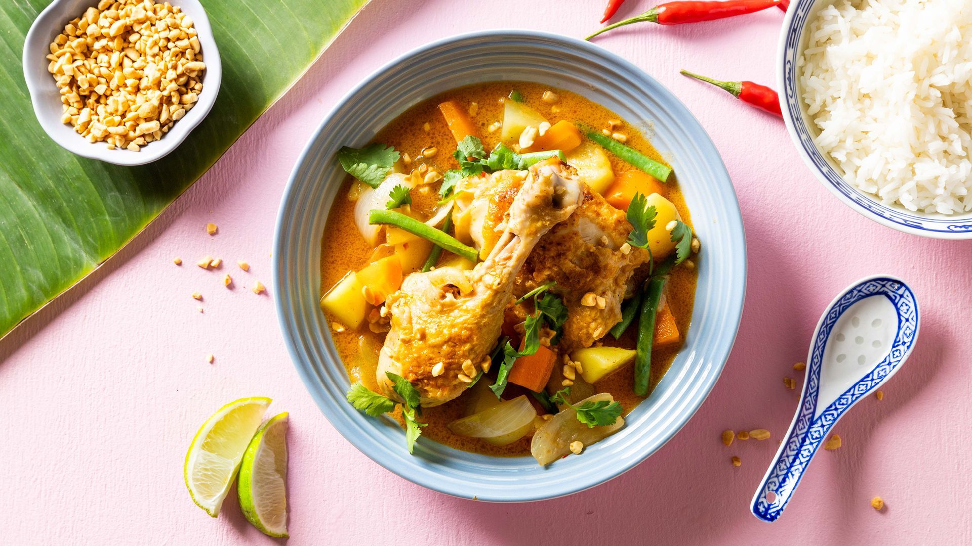 Thailandsk massaman-curry med kyllinglår, poteter og ris