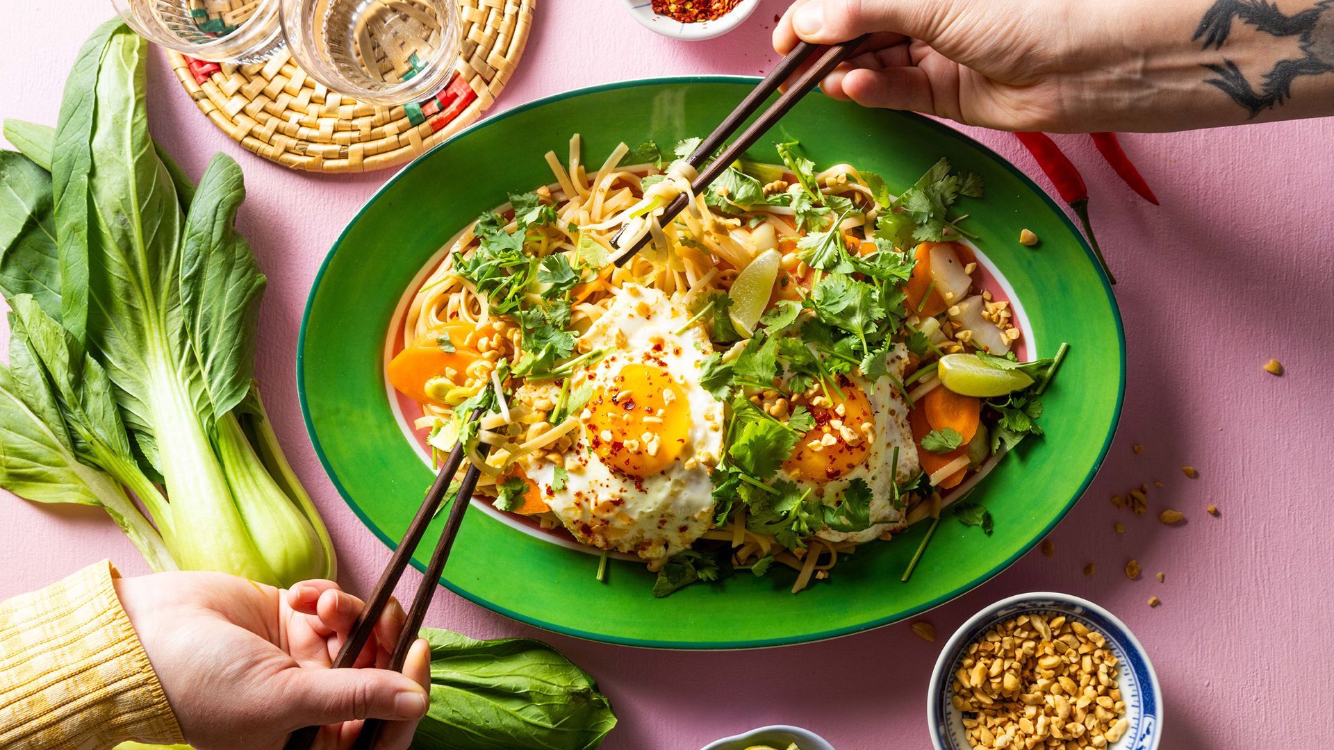 Har du lyst på en ny twist på pad thai? Da burde du prøve denne stirfryen! Her har vi latt oss inspirere av thailendernes kreativitet, og laget vår egen variant. Knasende bønnespirer, spretten pak choy – og viktigst av alt, et egg stekt med chili, ingefær og hvitløk. Når den rennende eggeplommen blander seg med de perfekt kokte nudlene blir dette skikkelig kosemat, en smakfull og fargerik tallerken.