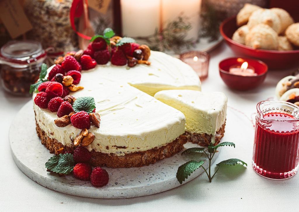 Hva med en iskake på lur om du får uventet julebesøk, eller kanskje en nydelig kake til nyttårsfeiringen? Fyldig, søt vaniljesmak, med en saftig og sprø nøttebunn. Prikken over i-en er en hjemmelaget bringebærsaus, både søt og syrlig. Hva enn som er anledningen, blir vi overrasket om denne iskaken ikke faller i smak. Her får du oppskriften.
